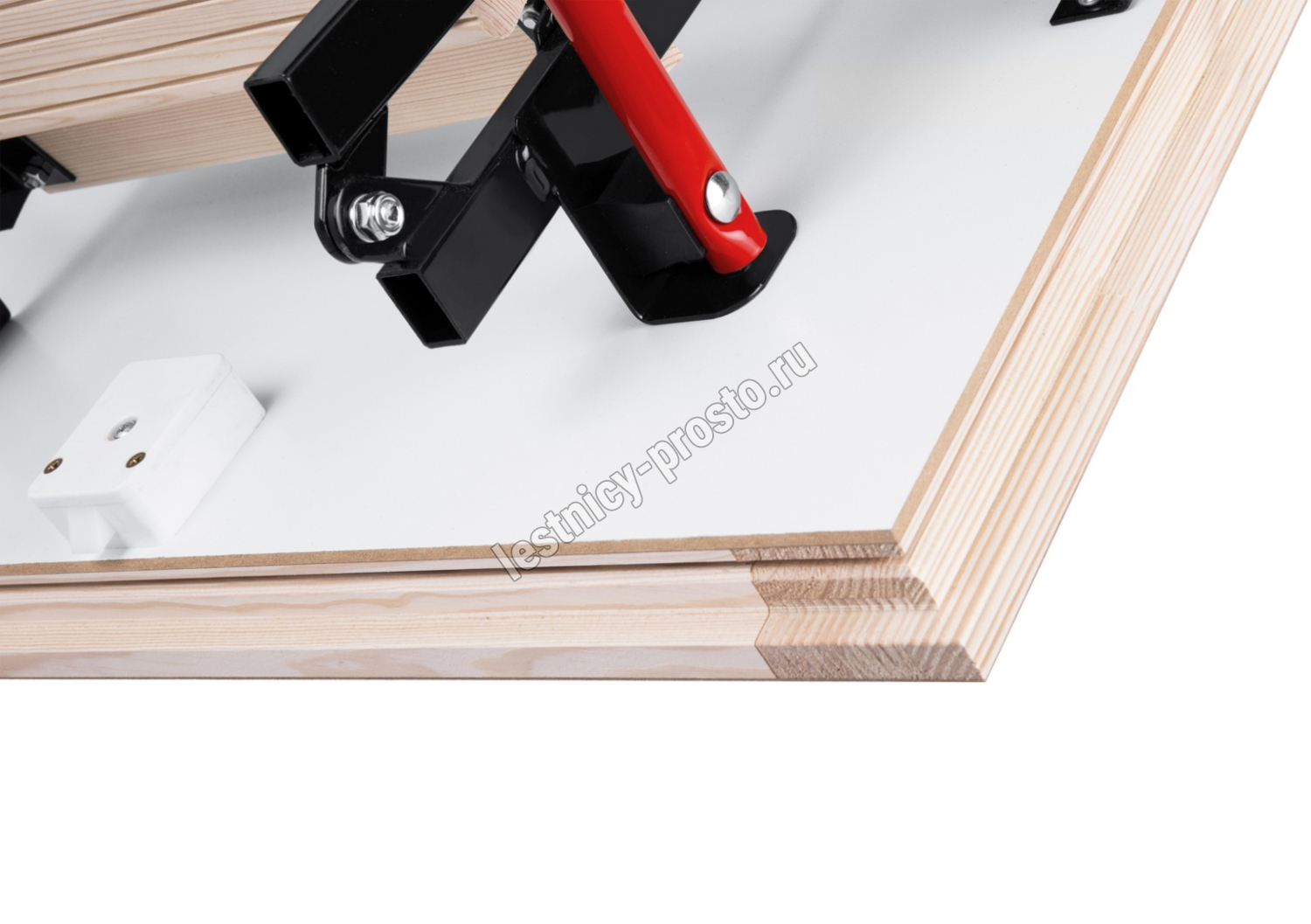 Термоизоляционная крышка имеет усиленную теплозащиту, облицована с двух сторон ДCП белого цвета. В комплекте деревянный стержень для открывания, металлический поручень и защитные накладки на ножки. Лестница идеально подходит для соединения с холодным чердаком.