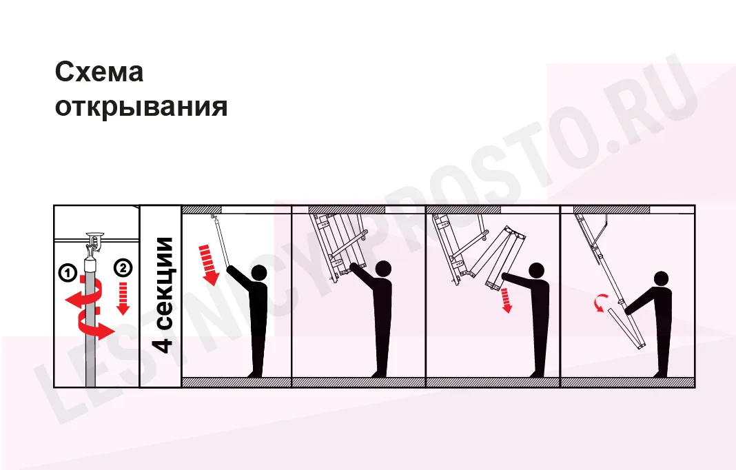 Складная 4-х секционная чердачная лестница. Рабочая поверхность полностью выполнена из алюминия. Термоизоляционная крышка типа "сэндвич" имеет усиленную теплозащиту, облицована с двух сторон ДВП белого цвета. По контуру короба имеется уплотнитель; Все металлические элементы лестницы покрыты порошковой краской.