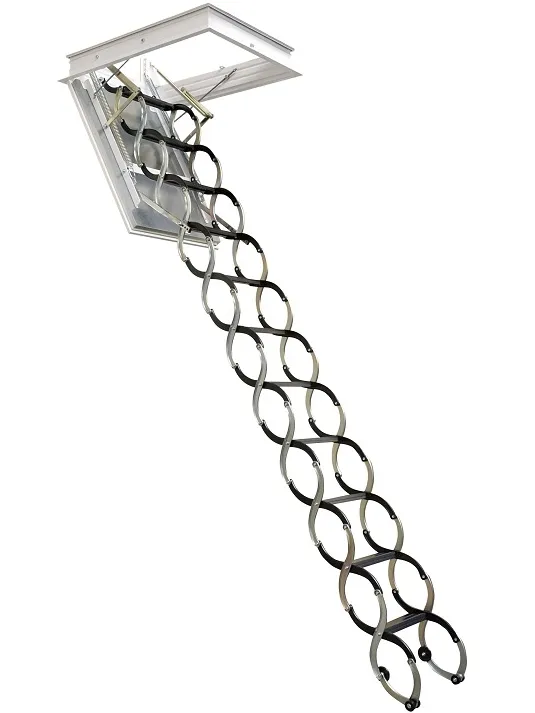 Складная 3-х секционная чердачная лестница. Рабочая поверхность полностью выполнена из алюминия. Термоизоляционная крышка типа "сэндвич" имеет усиленную теплозащиту, облицована с двух сторон ДВП белого цвета. По контуру короба имеется уплотнитель; Все металлические элементы лестницы покрыты порошковой краской.