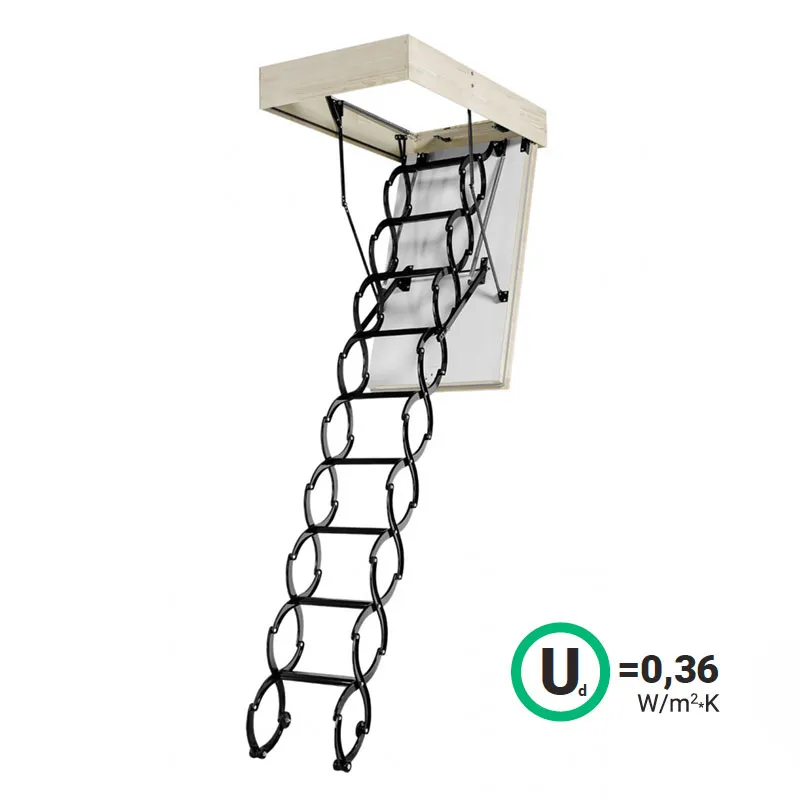 Все элементы лестницы выполнены из экологически чистых материалов и обработаны веществами, не содержащими тяжелых металлов. На ступенях антискользящие насечки. Короб лестницы изготовлен из металла. Термоизоляционная крышка типа "сэндвич" утеплена пенопластом, облицована с двух сторон ДСП белого цвета. Короб люка с уплотнителем. В комплекте деревянный стержень для открывания лестницы.