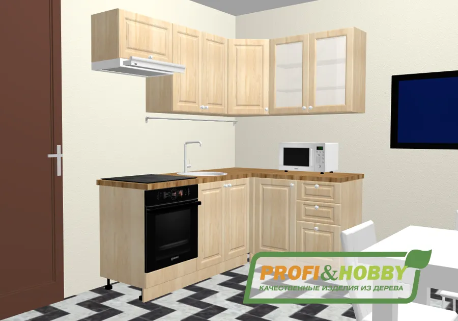 Угловой кухонный гарнитур из 100% массива сосны размером 2 на 1,4 и высотой 2,14 метра (верхние шкафчики 72 см). Благодаря модульной системе такая кухня может быть собрана зеркально, а, например, верхние шкафчики "под стекло" и "глухие" заменены местами. В стандартной комплектации нижние тумбы оснащены регулируемыми ножками высотой 100 мм и цоколем из массива сосны 95 мм.