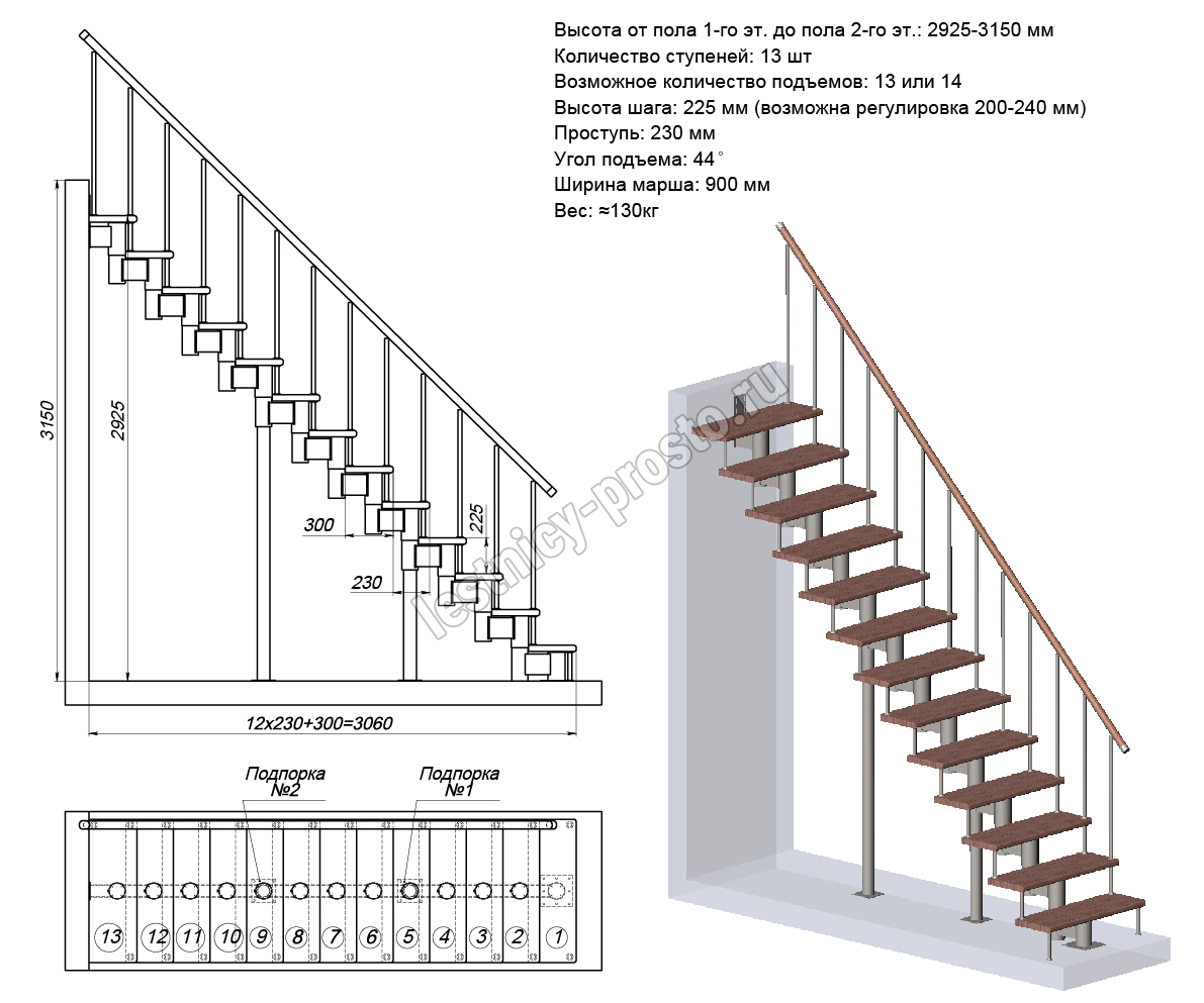 Высота лестницы 2925 - 3150 (13 ступеней) мм