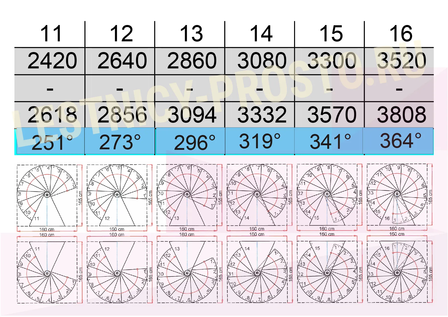 Параметры лестницы SPIRAL WOOD 160 с разным количеством ступеней