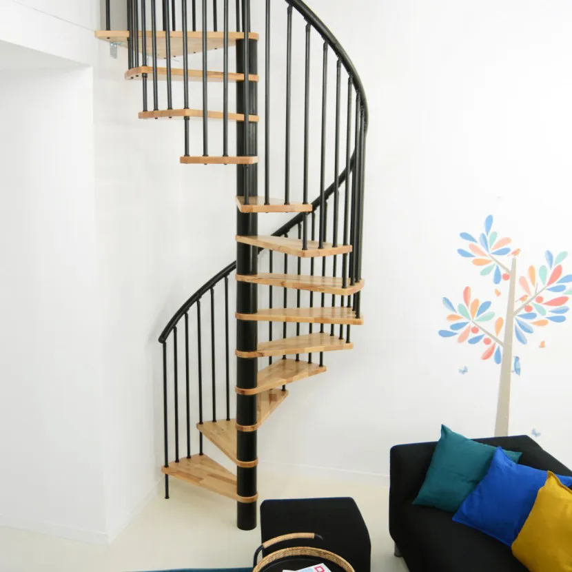 Ступени лестницы изготовлены из бука по технологии MULTIPLEX и покрыты износостойким защитным лаком. Лестница монтируется как по часовой стрелке, так и против. Возможен монтаж в круглый или квадратный проём. Ограждение: стальные трубки, Ø25 мм RAL 9016. Поручень: гибкий цельный ПВХ-поручень Ø40 мм белого цвета. Конструкция и балюстрада окрашены порошковым способом в белый цвет (RAL 9016).
